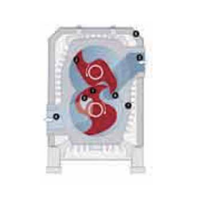 C 系列爪具有优化的高精度形状,可在不接触的情况下通过精密齿轮组同步滚动。可干式压缩并且无磨损。特殊密封件将压缩室同齿轮箱分离。爪式转子通过打开和关闭入口与出口通道控制介质输送。因此压缩室内无需使用密封液。